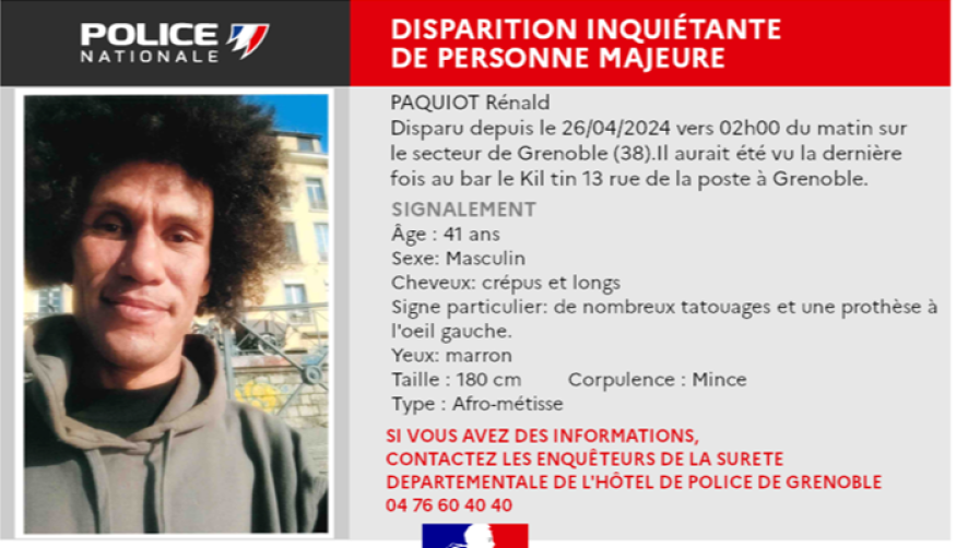 Cet homme originaire d’Aix-les-Bains en Savoie, âgé de 42 ans est porté disparu depuis le 26 avril vers 2h dans le secteur de Grenoble. Il aurait été vu pour la dernière fois au bar Kil Tin de la rue de la Poste à Grenoble.