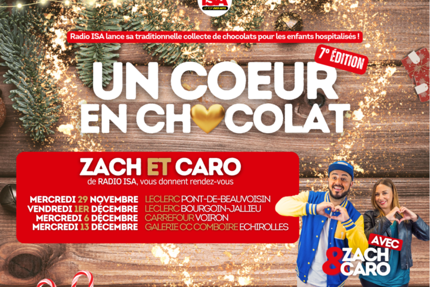 Radio ISA lance la 7ème édition de son opération "Un Coeur en Chocolat" pour les enfants hospitalisés du lundi 27 novembre au vendredi 15 décembre. Notre mission : collecter un maximum de chocolats, de bonbons et de friandises, qui seront redistribués aux enfants dans les hôpitaux de Bourgoin-Jallieu, Grenoble, Voiron et Contamine-sur-Arve (74) pour Noël.