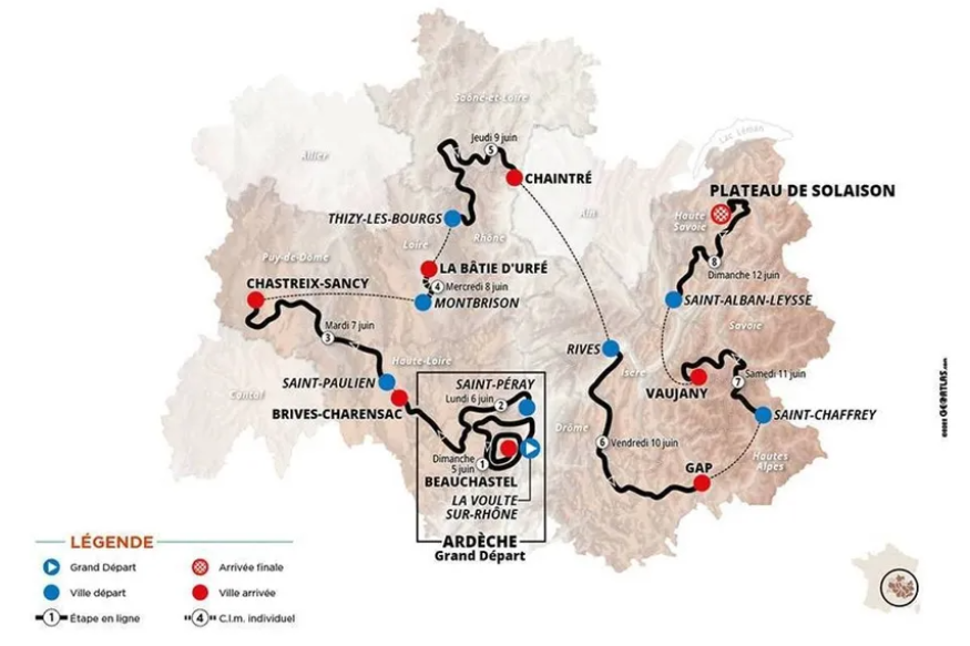 Les premières étapes passeront par la Haute-Loire, le Puy-de-Dôme, le Rhône, la Loire et la Saône-et-Loire lors de journées taillées pour les grimpeurs avant d’arriver en Isère.