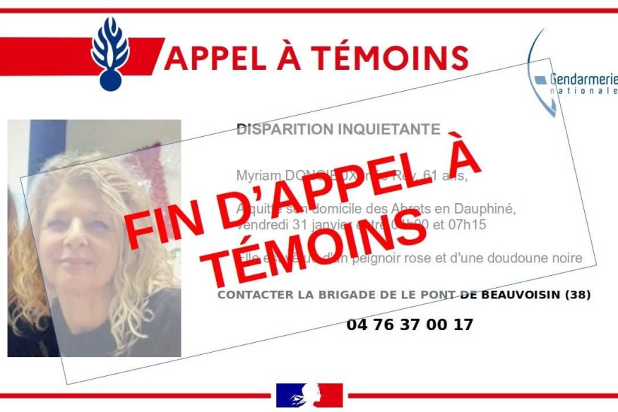Myriam Doncieux, 61 ans, portée disparue depuis le matin du 31 janvier aux Abrets-en-Dauphiné, a été retrouvée sans vie ce samedi 1er février. Sa disparition avait mobilisé une vaste battue citoyenne encadrée par les forces de l'ordre.