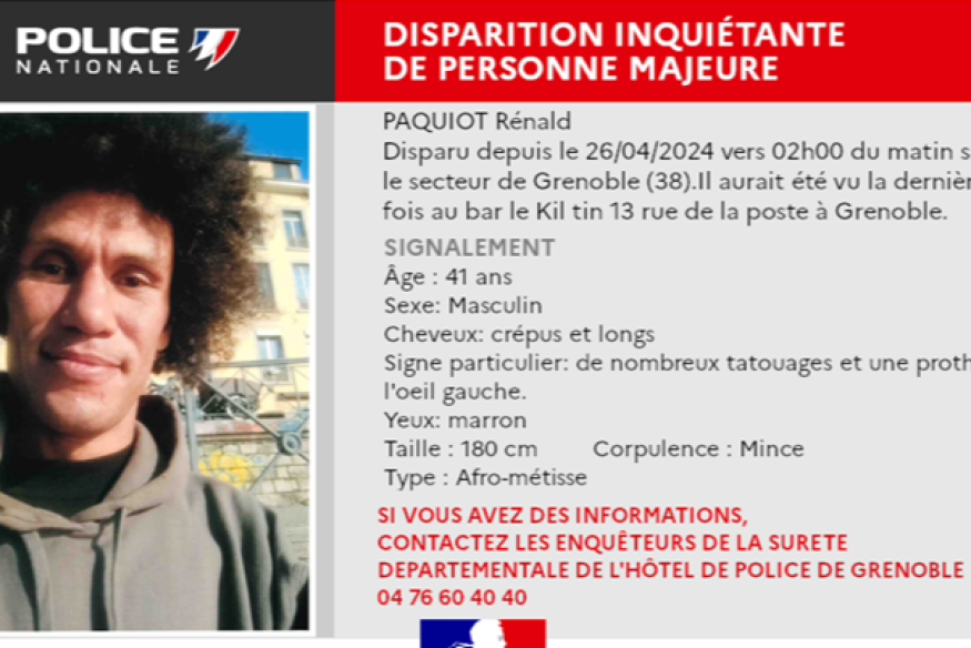 Cet homme originaire d’Aix-les-Bains en Savoie, âgé de 42 ans est porté disparu depuis le 26 avril vers 2h dans le secteur de Grenoble. Il aurait été vu pour la dernière fois au bar Kil Tin de la rue de la Poste à Grenoble.