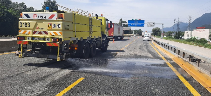 Les réparations urgentes de la chaussée avec du goudron suite à un incident technique lors de travaux, ont été réalisées ce vendredi 20 mai et les agents arrosent la zone concernée pour accélérer le refroidissement de l’enrobé apposé.